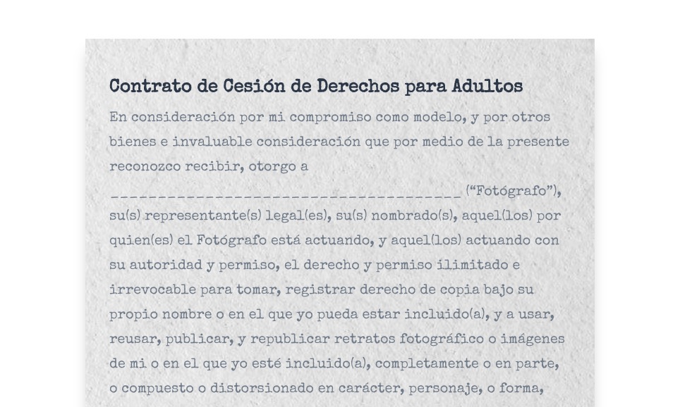 En consideración por mi compromiso como modelo, y por otros bienes e invaluable consideración que por medio de la presente reconozco recibir, otorgo a _____________________________________ (“Fotógrafo”), su(s) representante(s) legal(es), su(s) nombrado(s), aquel(los) por quien(es) el Fotógrafo está actuando, y aquel(los) actuando con su autoridad y permiso, el derecho y permiso ilimitado e irrevocable para tomar, registrar derecho de copia bajo su propio nombre o en el que yo pueda estar incluido(a), y a usar, reusar, publicar, y republicar retratos fotográfico o imágenes de mí o en el que yo esté incluido(a), completamente o en parte, o compuesto o distorsionado en carácter, personaje, o forma, sin restricción en cuanto a cambios o alteraciones, en conjunto con mi propio nombre o nombre ficticio, o reproducciones del mismo en color o de otra manera, hecho a través de cualquier medio en su(s) estudio(s) o en otro lugar, y en cualquier y todos los medios conocidos ahora o de ahora en adelante para ilustración, promoción, arte, editorial, publicidad, comercio, o cualquier otro propósito y demás. También consiento al uso de cualquier material publicado en conjunto con el mismo.
