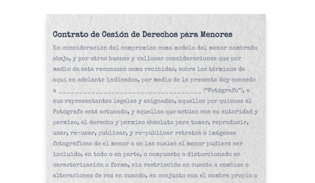 En consideración del compromiso como modelo del menor nombrado abajo, y por otras buenas y valiosas consideraciones que por medio de esta reconozco como recibidas, sobre los términos de aquí en adelante indicados, por medio de la presente doy concedo a ___________________________________ (“Fotógrafo”), a sus representantes legales y asignados, aquellos por quienes el Fotógrafo está actuando, y aquellos que actúan con su autoridad y permiso, el derecho y permiso absoluto para tomar, reproducir, usar, re-usar, publicar, y re-publicar retratos o imágenes fotográficas de el menor o en las cuales el menor pudiera ser incluido, en todo o en parte, o compuesto o distorcionado en caracterización o forma, sin restricción en cuanto a cambios o alteraciones de vez en cuando, en conjunto con el nombre propio o ficticio del menor, o reproducciones en color o de otro tipo, hechos a través de cualquier medio en su estudio o en cualquier otro lugar, y en cualquier y todos los medios conocidos hoy o en el futuro, para arte, publicidad, comercio, o cualquier otro propósito. También consiento al uso de cualquier temática publicada conjuntamente.