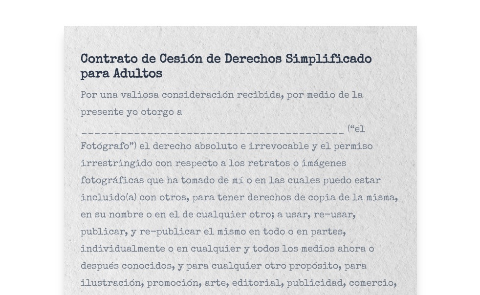 Por una valiosa consideración recibida, por medio de la presente yo otorgo a ________________________________________ (“el Fotógrafo”) el derecho absoluto e irrevocable y el permiso irrestringido con respecto a los retratos o imágenes fotográficas que ha tomado de mí o en las cuales puedo estar incluido(a) con otros, para tener derechos de copia de la misma, en su nombre o en el de cualquier otro; a usar, re-usar, publicar, y re-publicar el mismo en todo o en partes, individualmente o en cualquier y todos los medios ahora o después conocidos, y para cualquier otro propósito, para ilustración, promoción, arte, editorial, publicidad, comercio, o cualquier otro propósito sin restricción en cuanto a alteración; y a utilizar mi nombre en conexión con el mismo si así lo desea.